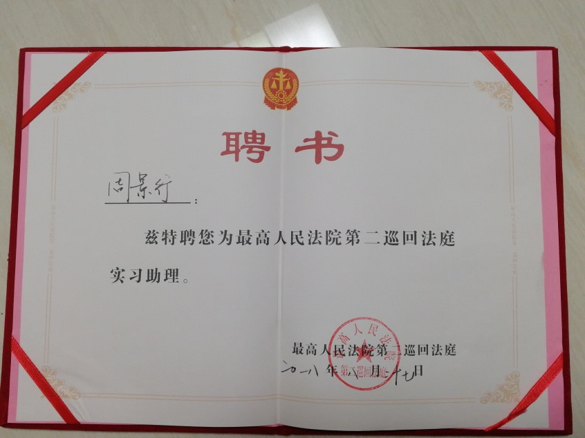 8月28日,最高人民法院第二巡回法庭开展第七批实习助理选拔工作暨第六批实习助理结业活动,来自大连海洋大学、辽宁大学、东北大学、吉林大学、黑龙江大学、辽宁师范大学、沈阳工业大学、沈阳师范大学和大连海事大学等九所法学院校的40余位优秀学生参加了选拔。经过层层面试、严格筛选,我校法学院(海警学院)2017级法律硕士研究生周景行成功入选最高人民法院第二巡回法庭实习助理。