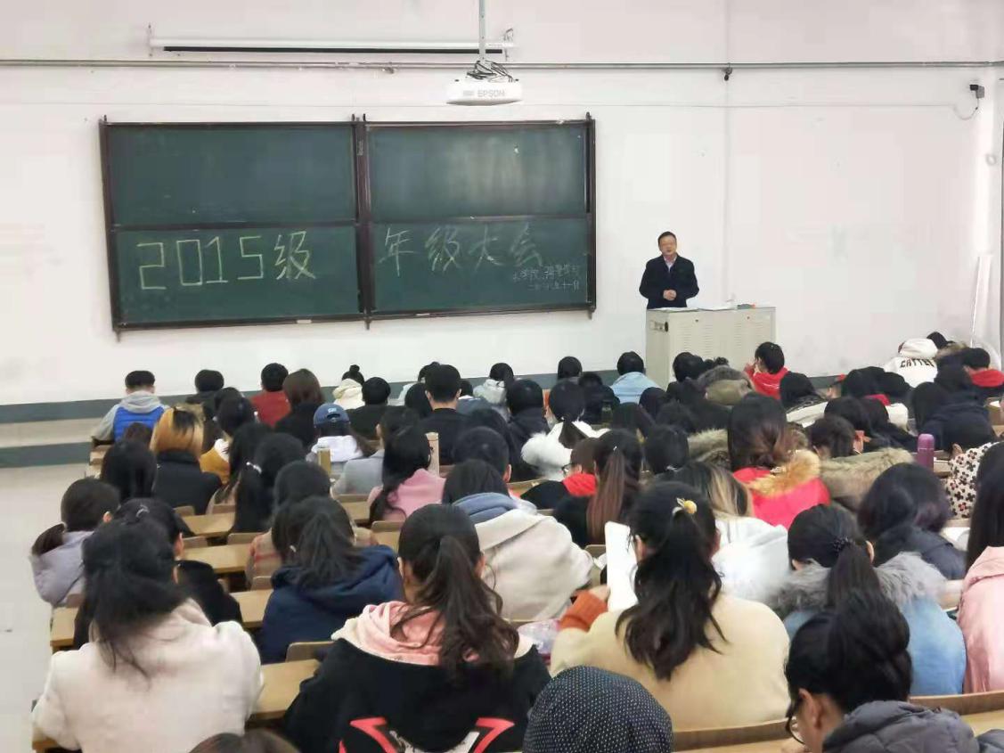 首先,他针对2015级同学密切关注的考研、公考、就业等问题进行了细致的讲解,提醒同学们在就业协议书填写过程中应注意的问题和细节;针对报考研究生的同学,他要求考研的同学们一定要适当放松,摆正心态,不能过于紧张,更不能临时退缩。同时,他就2015级学生毕业及学位授予的条件进行了说明。最后,他特别强调在临近毕业的一个学期,希望2015级全体同学能够认真对待考试,诚信考试,顺利毕业,并表达了对全体同学的殷切希望。