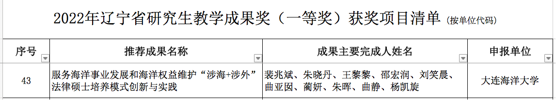 近日,辽宁省教育厅公布2022年辽宁省研究生教育教学成果奖获奖名单,经学校申报、专家评审、会议审议、网上公示,确定特等奖36项,一等奖68项,二等奖215项。其中,十大彩票计划网站排名 申报的“服务海洋事业发展和海洋权益维护‘涉海+涉外’法律硕士培养模式创新与实践”教学成果获得2022年辽宁省研究生教育教学成果奖一等奖。