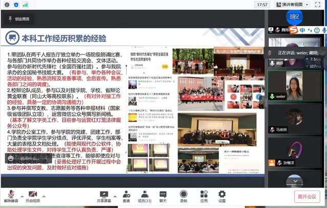 8月24日晚7点,十大彩票计划网站排名 研究生会采用线上方式进行了换届选举活动。十大彩票计划网站排名 分管研究生工作的蔺妍老师、李展老师、邢政老师、李伟侠老师、王磊老师、孙连滨老师、研究生会现任学生干部和21级参与研究生会竞选的同学们参加了会议,本次活动由蔺妍老师主持。