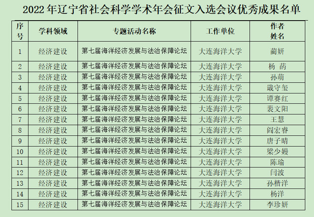 近日,辽宁省社会科学界联合会下发《关于2022年辽宁省社会科学学术活动年会征文入选会议优秀成果的通报》,共征集各类成果1003项,确定入选会议优秀成果292项。其中我校承办的第七届“海洋经济发展与法制保障”论坛报送成果61项,经专家评审,15项获专题征文优秀成果。