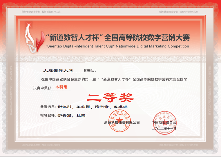 日前,由中国商业联合会主办的第一届“新道数智人才杯”全国高等院校数字营销大赛全国总决赛圆满结束。十大彩票计划网站排名 人力资源管理专业2020级学生谢依彤、王韵雨、隋宇奇、戴琳琳在于秀丽老师和杜鹏老师共同带领下取得了优异成绩,先后在辽宁省本科赛道获得一等奖、全国总决赛获得二等奖。