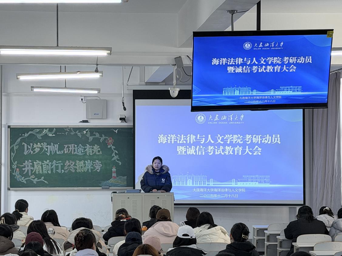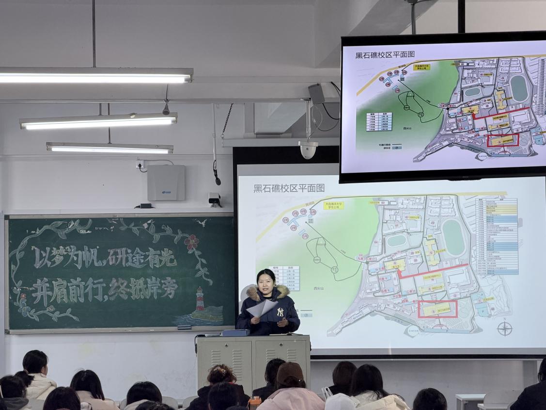 在大黑石校区二教302教室举办“以梦为帆,研途有光”2025年考研冲刺动员暨诚信考试教育大会。会议由2022级辅导员李展主持,2023级辅导员郭艳丽和全体考研学生参加了会议。