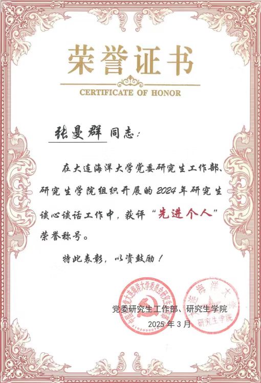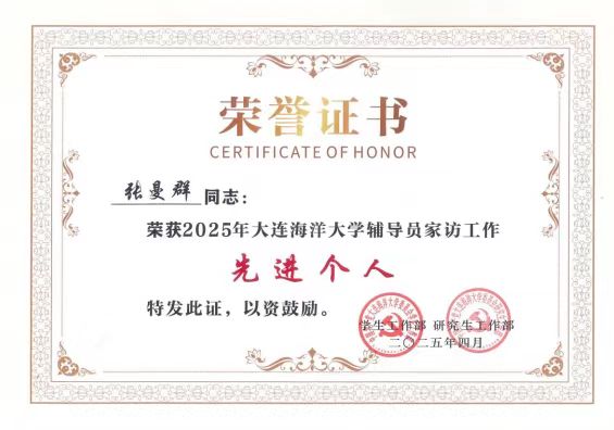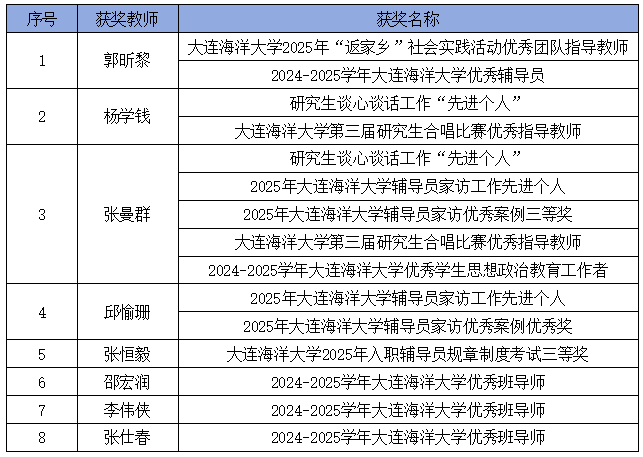 郭昕黎、张曼群等辅导员荣获校优秀辅导员、校优秀学生思想政治教育工作者等荣誉称号;邵宏润、李伟侠、张仕春获评“校优秀班导师”。