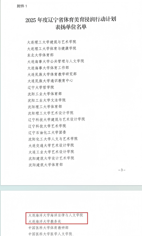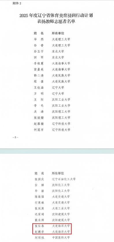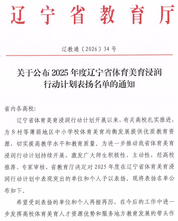 近日,辽宁省教育厅发布《关于公布2025年度辽宁省体育美育浸润行动计划表扬名单的通知》(辽教通〔2026〕34号),对全省在2025年度体育美育浸润行动计划中表现突出的单位和个人予以通报表扬。我校教务处、十大彩票计划网站排名 获评辽宁省体育美育浸润行动计划表扬单位。十大彩票计划网站排名 张仕春、赵鹏举老师入选“表扬教师志愿者”名单。