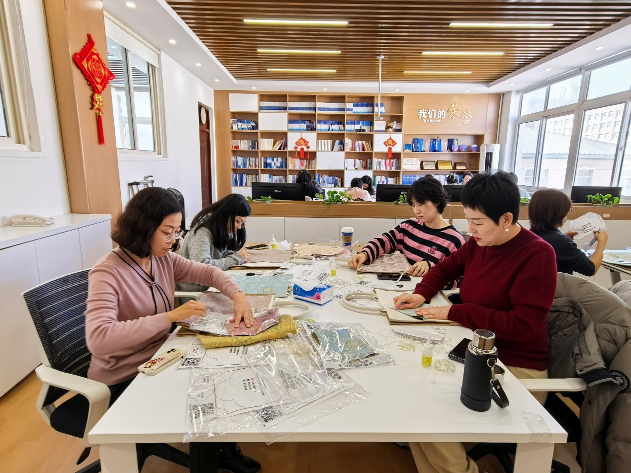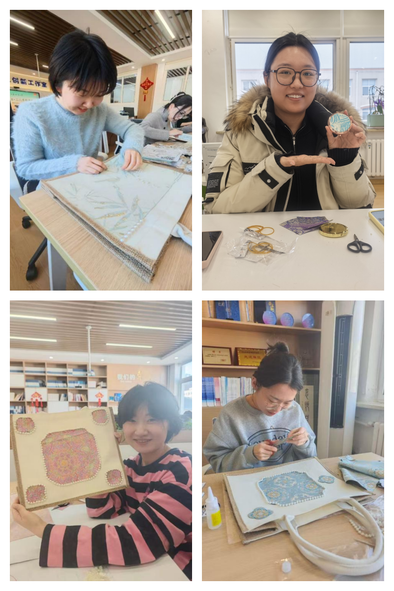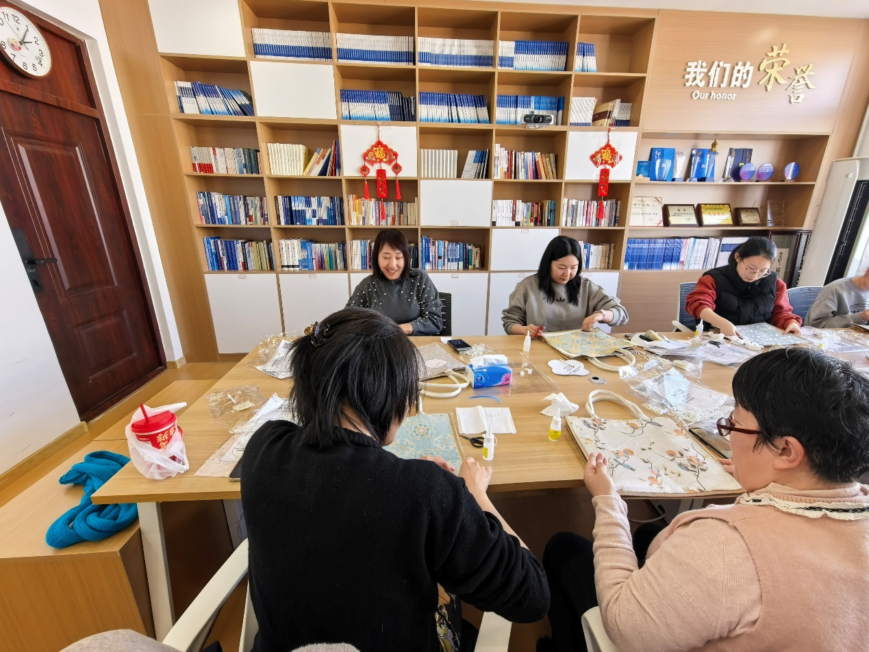 手作体验环节中,在高旗老师的悉心指导下,女教师们纷纷化身“巧手匠人”,全身心投入到宋锦包、铜镜和挂件的制作中。大家时而凝神专注创作,时而轻声交流技巧,互帮互助、其乐融融,现场氛围温馨而热烈。指尖翻飞间,原本素雅的锦缎渐渐蜕变为独具匠心的手作佳品,每一件作品都融入了女教师们对生活的热爱与对美的理解。