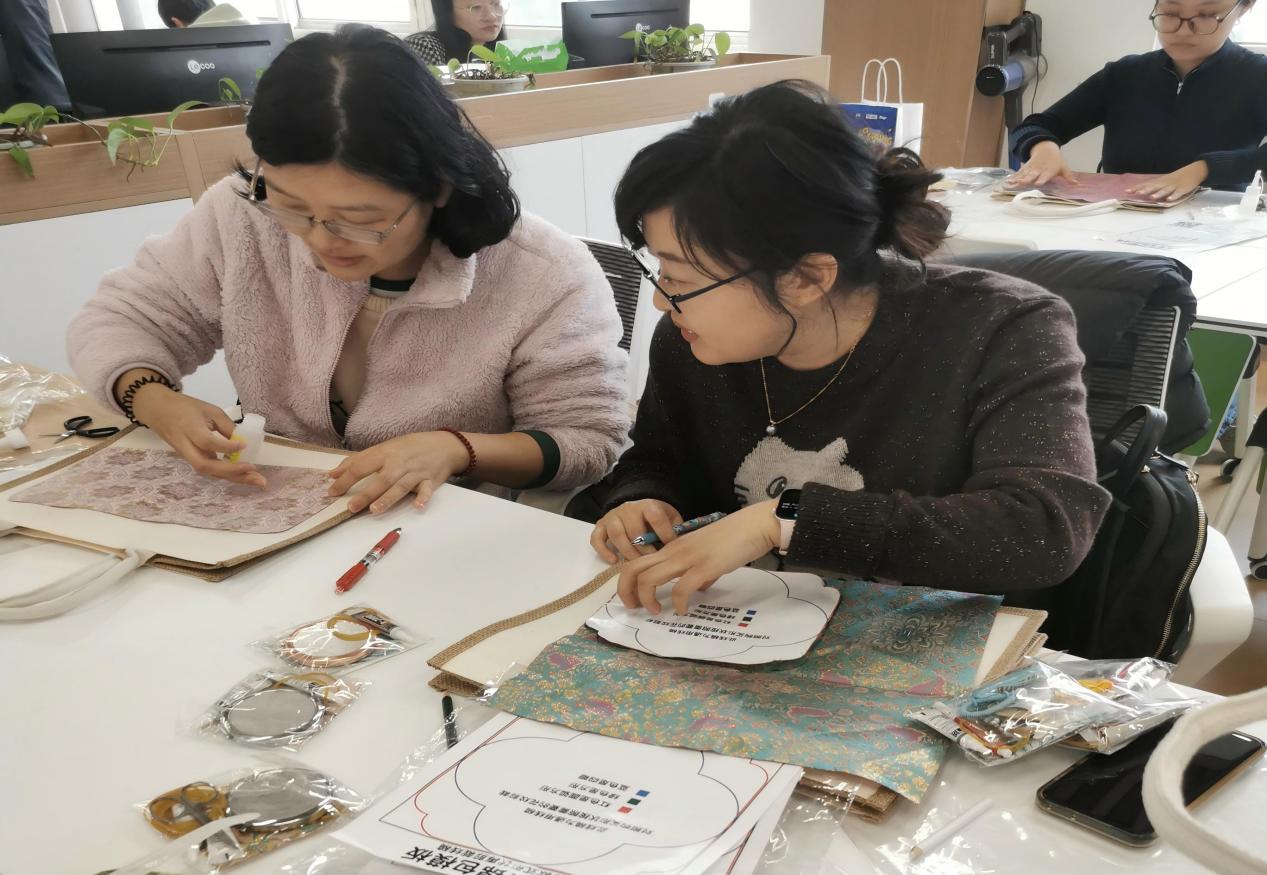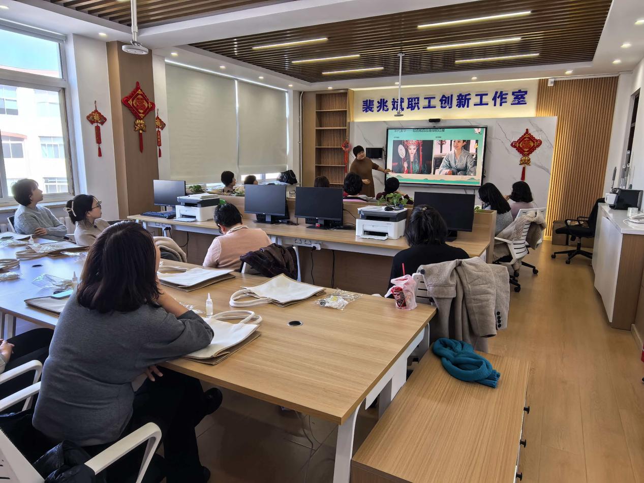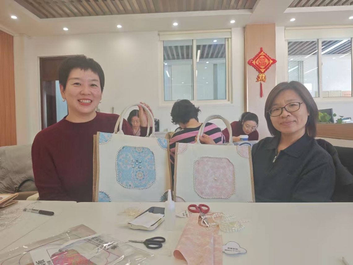 手作体验环节中,在高旗老师的悉心指导下,女教师们纷纷化身“巧手匠人”,全身心投入到宋锦包、铜镜和挂件的制作中。大家时而凝神专注创作,时而轻声交流技巧,互帮互助、其乐融融,现场氛围温馨而热烈。指尖翻飞间,原本素雅的锦缎渐渐蜕变为独具匠心的手作佳品,每一件作品都融入了女教师们对生活的热爱与对美的理解。